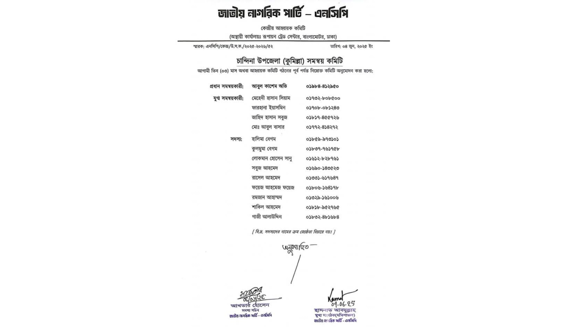 আবুল কাশেম অভিকে প্রধান সমম্বয়কারী করে জাতীয় নাগরিক পার্টি এনসিপির চান্দিনা উপজেলা সমম্বয় কমিটি গঠন