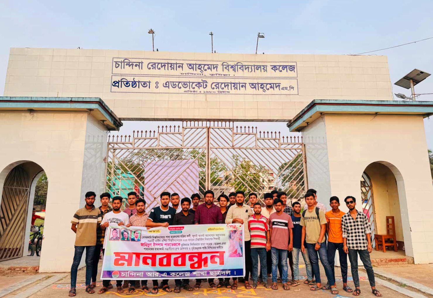ছাত্রদল কর্মী পারভেজ হত্যা প্রতিবাদ ও সন্ত্রাসীদের গ্রেপ্তারের দাবিতে চান্দিনা আর.এ. কলেজ শাখা ছাত্রদলের মানববন্ধন